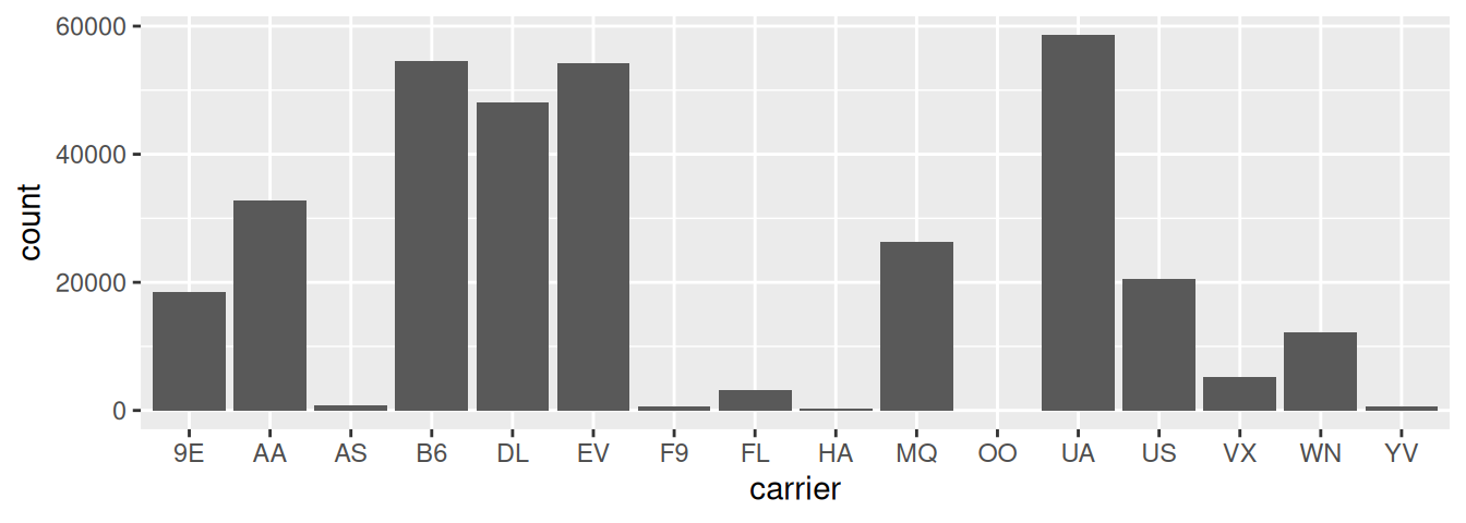 We’ll see later in Chapter 3 on data wrangling that this code uses the dplyr package for data wrangling to achieve our goal: it takes the flights data frame and filters it to only return the rows where carrier is equal to "AS", Alaska Airlines’ carrier code. Other examples of carrier codes include “AA” for American Airlines and “UA” for United Airlines. Recall from Section 1.2 that testing for equality is specified with == and not =. Fasten your seat belts and sit tight for now however, we’ll introduce these ideas more fully in Chapter 3.