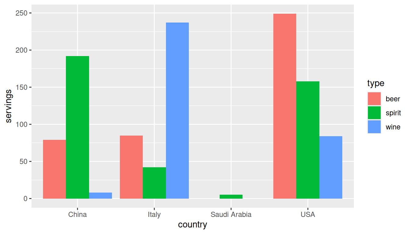 )With our drinks_smaller_tidy “tidy” format data frame, we can now produce a side-by-side AKA dodged barplot using geom_col() and not geom_bar(), since we would like to map the servings variable to the y-aesthetic of the bars.