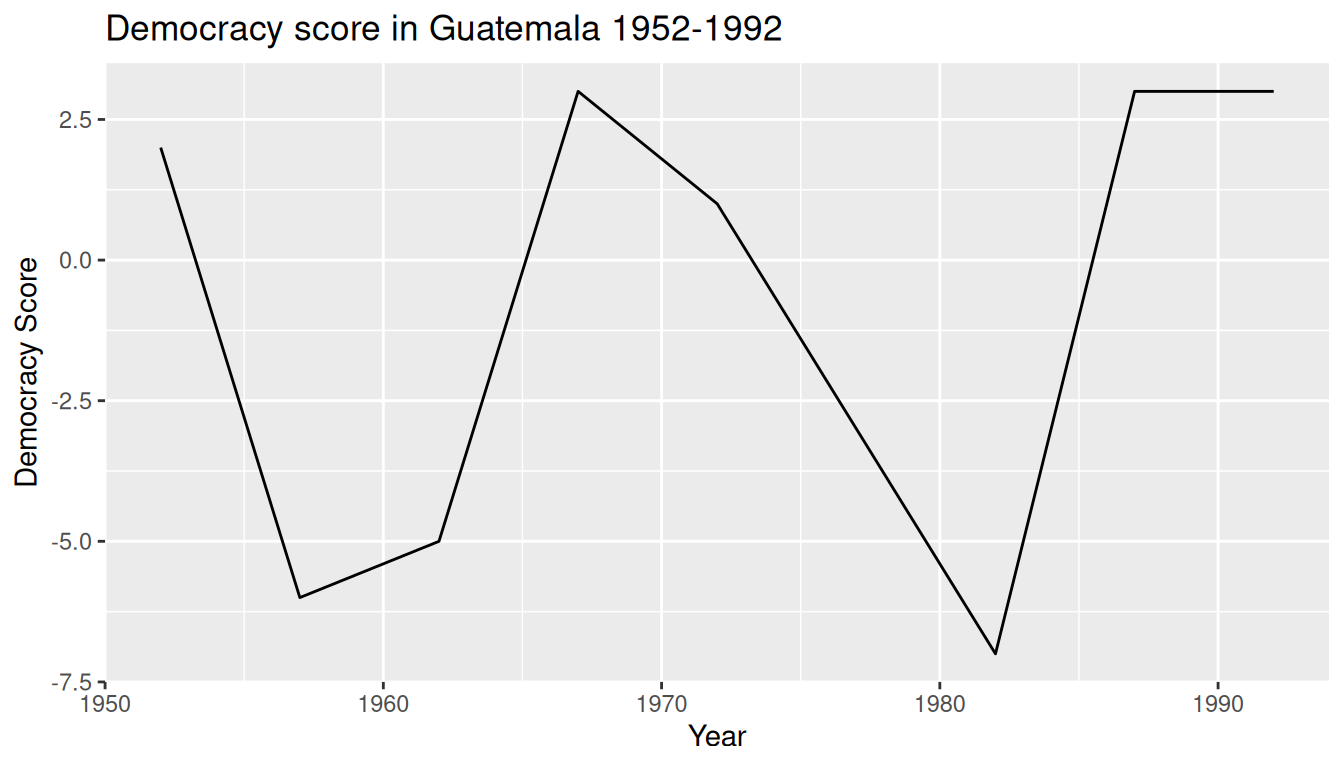 mutate(year = as.numeric(year))We can now create the plot to show how the democracy score of Guatemala changed from 1952 to 1992 using a geom_line():