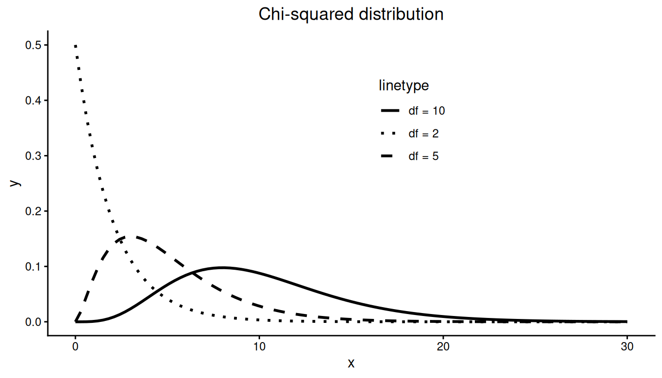 The chi-squared distribution is unimodal but skewed right. The chi-squared distribution depends on one parameter \(df\).